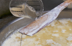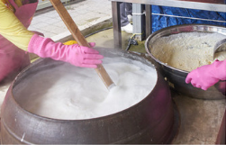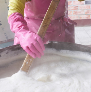콩물을 끓이고 간수를 넣고 두부가 만들어 질수 있도록 저어 줍니다.