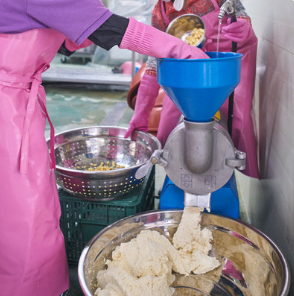 콩물을 짜서 콩물과 비지를 분류 합니다.